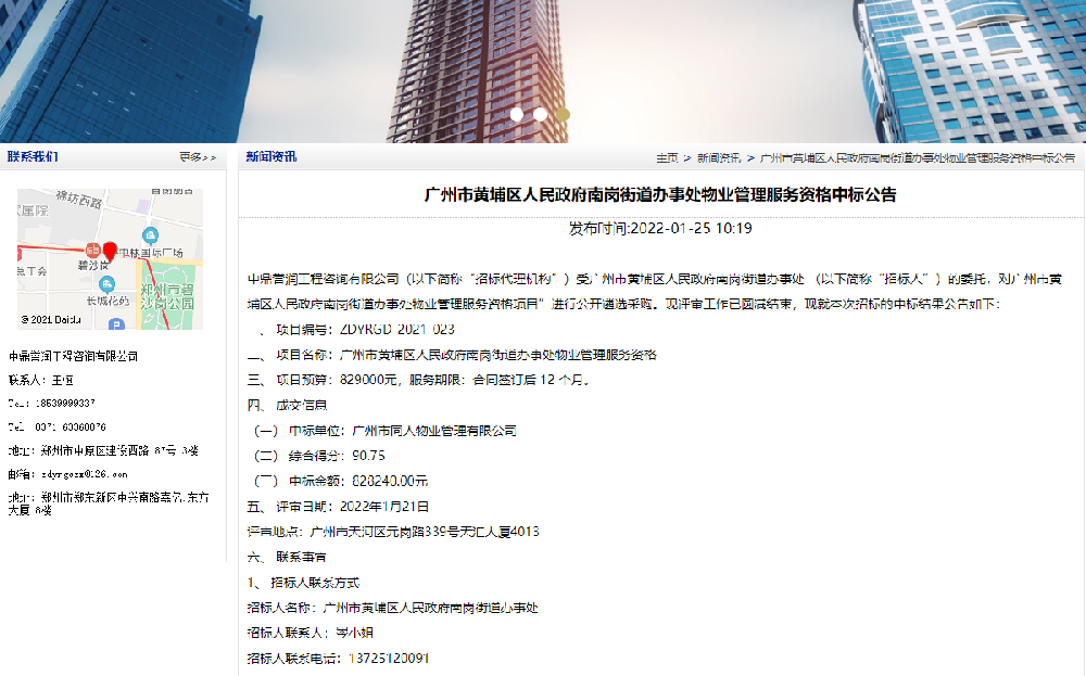 鼎點(diǎn)娛樂(lè)工程咨詢(xún)有限公司(以下簡(jiǎn)稱(chēng)“招標(biāo)代理機(jī)構(gòu)”)受廣州市黃埔區(qū)人民政府南崗街道辦事處 (以下簡(jiǎn)稱(chēng)“招標(biāo)人”)的委托,對(duì)廣州市黃埔區(qū)人民政府南崗街道辦事處物業(yè)管理服務(wù)資格項(xiàng)目”進(jìn)行公開(kāi)遴選采購(gòu)。現(xiàn)評(píng)審工作已圓滿(mǎn)結(jié)束,現(xiàn)就本次招標(biāo)的中標(biāo)結(jié)果公告如下:一、項(xiàng)目編號(hào):ZDYRGD-2021-023二、項(xiàng)目名[詳細(xì)]