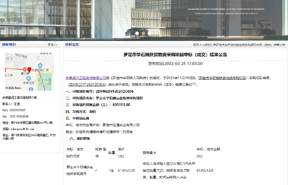 鼎點(diǎn)娛樂(lè)工程咨詢(xún)有限公司受《羅定市華石鎮(zhèn)人民政府》的委托,于2021年11月19日就(羅定市華石鎮(zhèn)扶貧物資采購(gòu)項(xiàng)目)采購(gòu)項(xiàng)目編號(hào):(ZDYRGDYF2021ZC006)詢(xún)價(jià)進(jìn)行采購(gòu)。現(xiàn)就本次采購(gòu)的中標(biāo)(成交)結(jié)果公告如下:一、采購(gòu)項(xiàng)目編號(hào):ZDYRGDYF2021ZC006二、采購(gòu)項(xiàng)目名稱(chēng):羅定市華石鎮(zhèn)扶貧物資采購(gòu)項(xiàng)目三、采購(gòu)項(xiàng)目預(yù)算金額([詳細(xì)]